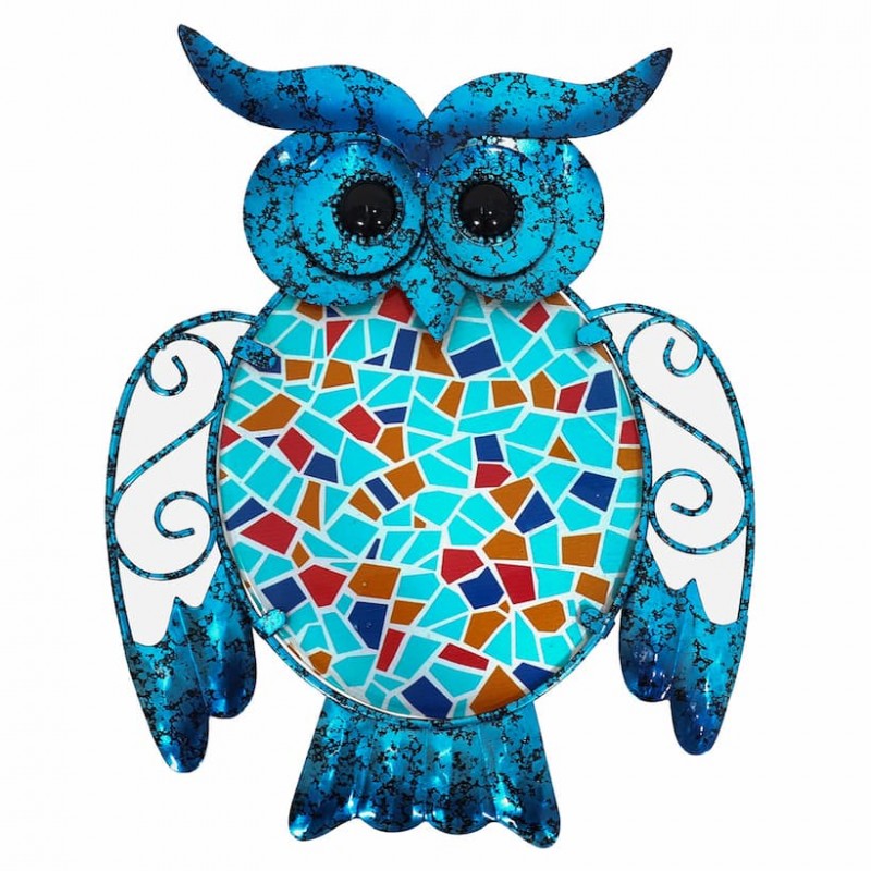 Aplique muy decorativo para colgar en la pared en forma de búho en tonos azules y multicolor, aportando diversión en el hogar.