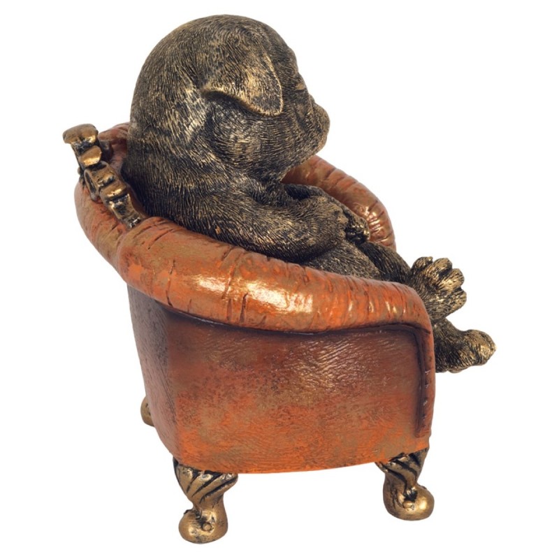 Figura decorativa en forma de un espectacular perro Bulldog durmiendo en sofá decorado de forma muy especial que aportará un toque encantador a tu decoración.