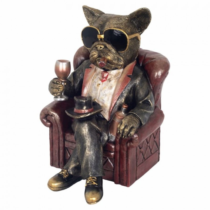 Figura decorativa en forma de un espectacular perro Bulldog con copa y puro decorado de forma muy especial que aportará un toque encantador a tu decoración.