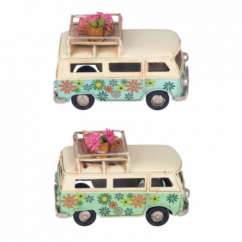 Set de dos figuras originales de furgonetas en distintos colores decorados con flores de colores con flores sobre sus vacas, aportando un toque de color a la decoración de tu hogar con un aire totalmente hippie.