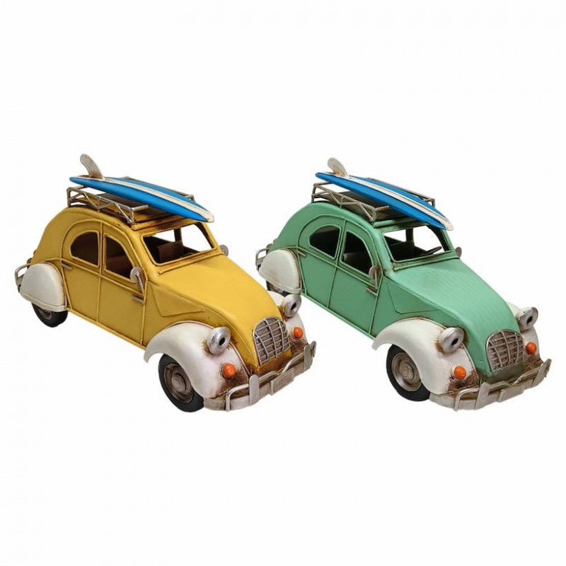 Set de dos figuras originales de coches en distintos colores con unas bonitas tablas de surf estilo marinero, aportando un toque de color a la decoración de tu hogar.
